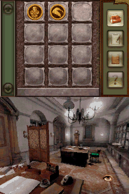Le gameplay à été conservé et adapté pour la console de Nintendo, ainsi l’on retrouve une interface avec un curseur présent en continue à l’écran du bas, c’est sur ce dernier que tout se déroulera, sur l’écran du haut on trouvera l’affichage en permanence de l’inventaire que l’on pourra faire apparaître sur l’écran du bas par une simple pression sur le bouton L (gâchette gauche) de la DS, afin de pouvoir interagir avec ces derniers.