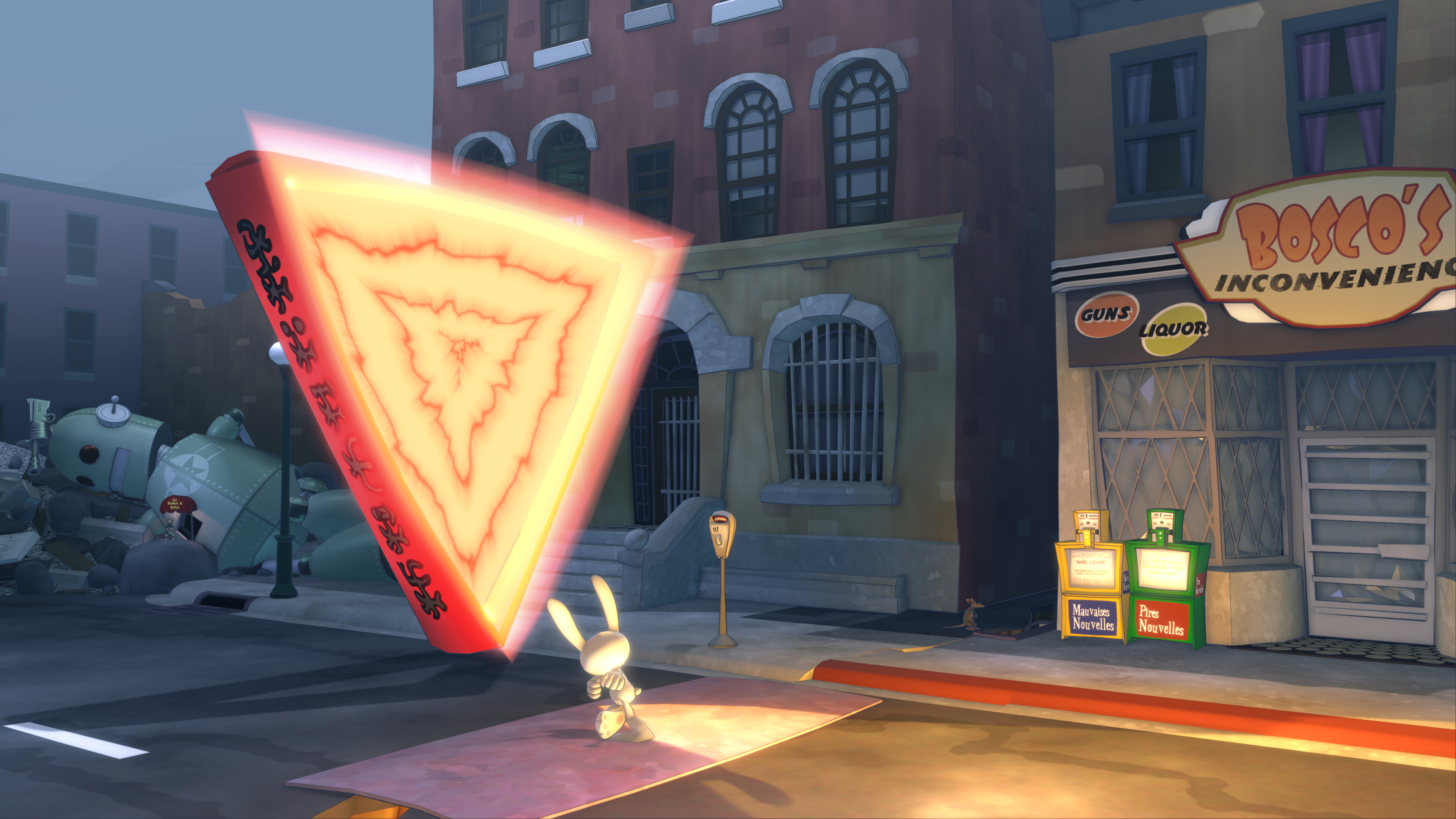 Ce remaster, comme il se doit ne change bien entendu rien à l’histoire originale, nous retrouvons donc Sam & Max, deux personnages aux antipodes l’un de l’autre. Sam, le chien, étant le plus posé et est l’on peut dire le cerveau du duo, là ou Max, le lapin, est hyperactif, psychotique et n’aura de cesse de résoudre les problèmes de la manière la plus violente possible. Alors que Max prend son rôle obtenu dans la précédente très à cœur, nos amis se voient attaqués par un robot géant.
